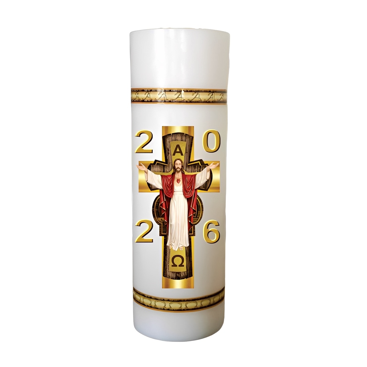 - Contem 1 Círio Pascal, no tamanho de 30cm de altura por 7,8cm de diâmetro, com aplique Adesivo - Os modelos acompanham os 5 cravos.