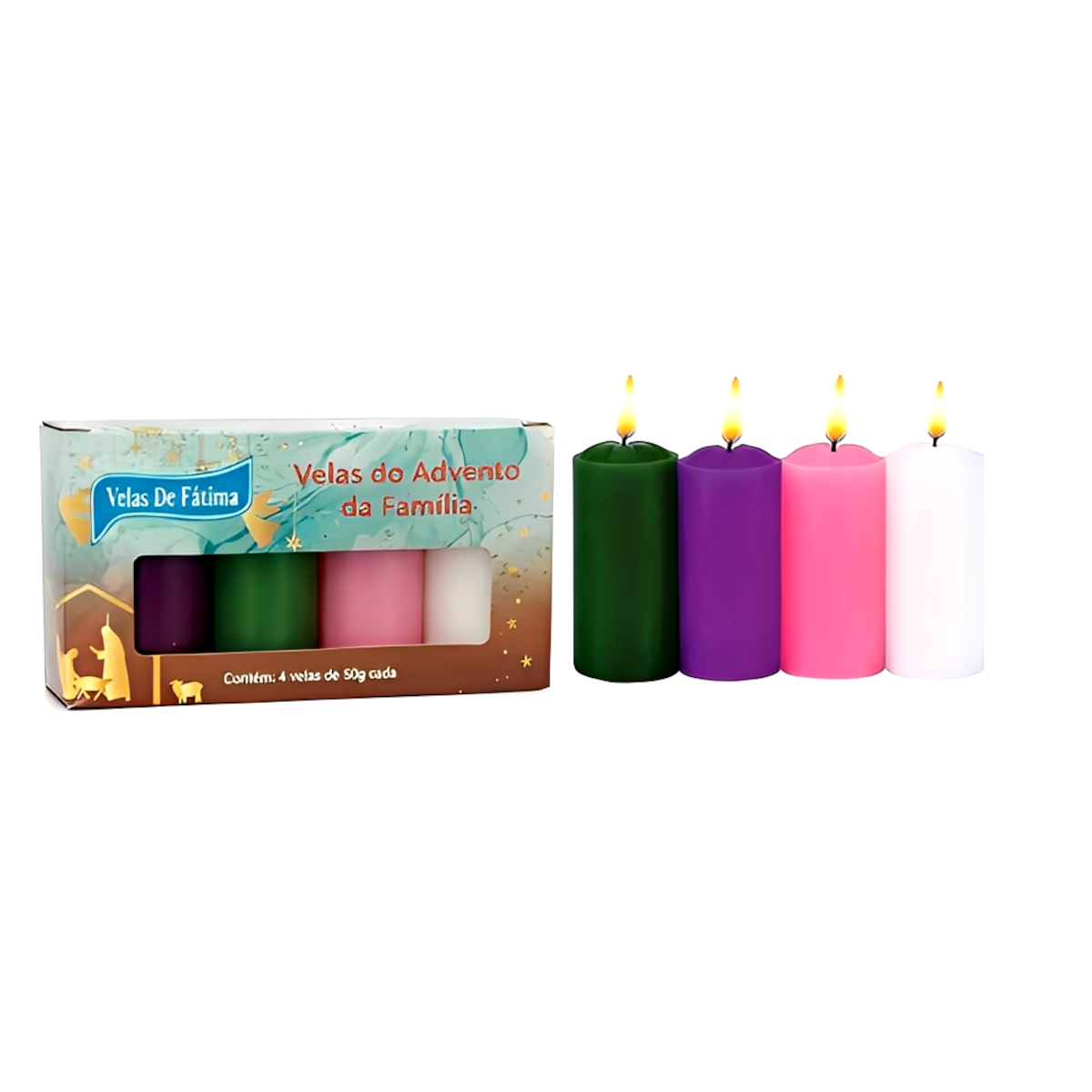 Quatro velas do Advento de 50g cada, das seguintes cores: vermelha, roxa, verde e branca.