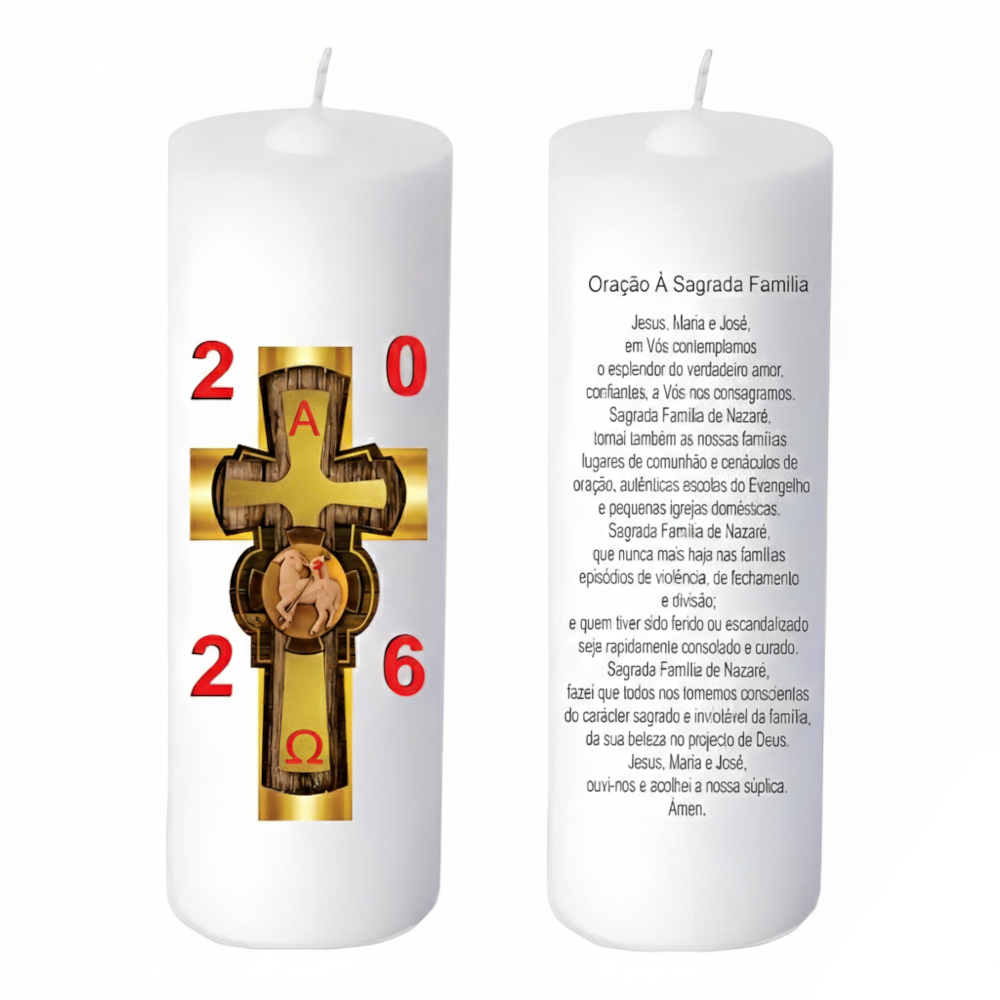- 1 Mini Círio Pascal - Para Uso em Família no tamanho de 14 cm de altura por 5 cm de diâmetro adesiva do com imagem e oração.