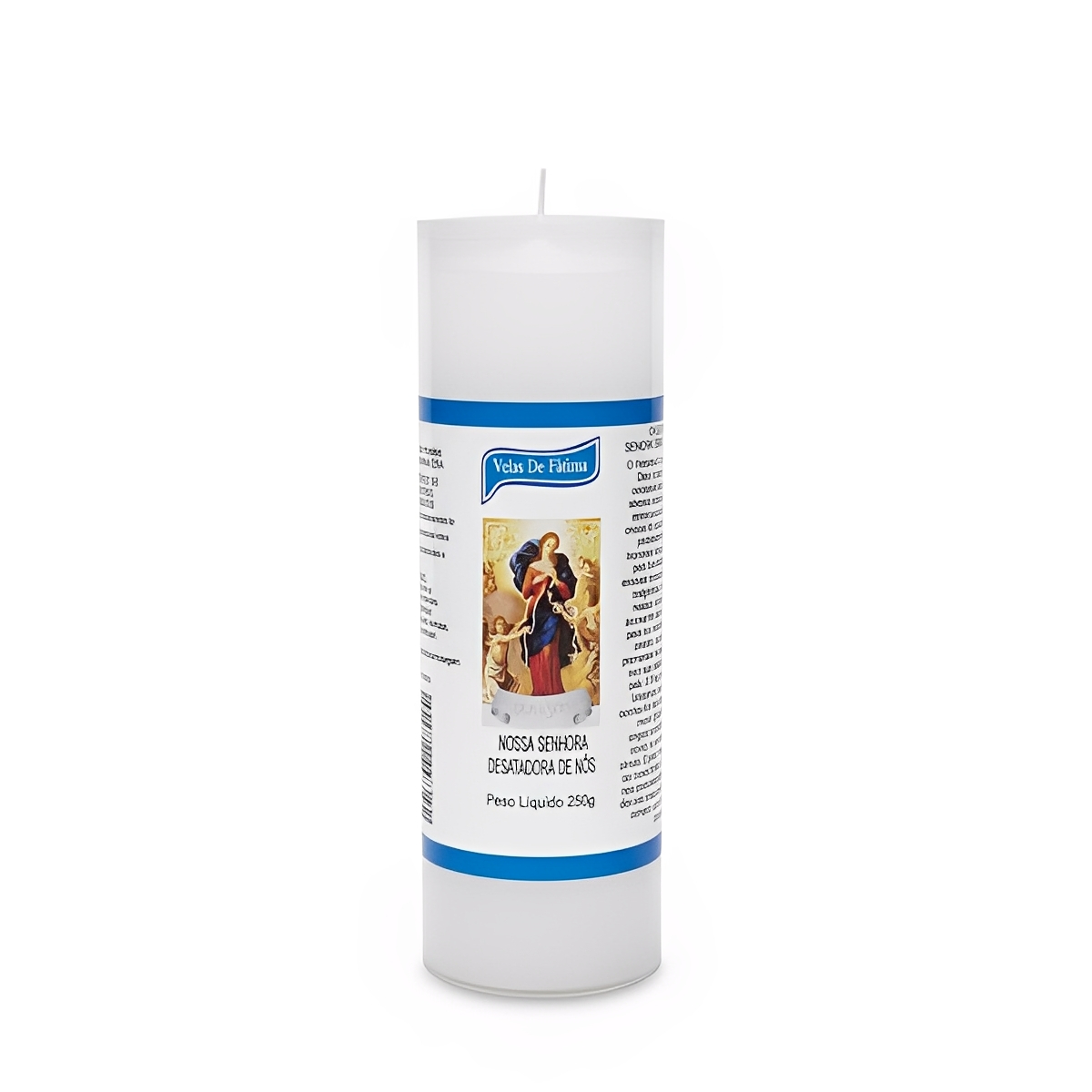 - 12 velas votivas de 7 dias com imagem Nossa Senhora Desatadora de Nós embalada em tubo pvc anti chama com tampa.