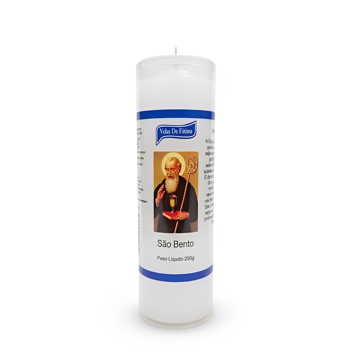 - 12 velas votivas de 7 dias com imagem São Bento embalada em tubo pvc anti chama com tampa.